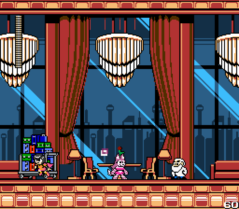 During development, I had the idea to implement fullscreen borders, inspired by both the Legacy Collection’s system of borders, as well as other games with non-widescreen resolutions, like Undertale. In fact, the initial test border was Legacy Collection’s Mega Man 2 border.
